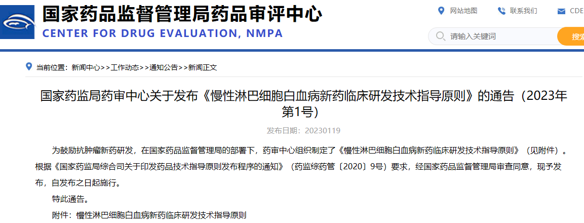 國家藥監(jiān)局藥審中心關(guān)于發(fā)布《慢性淋巴細胞白血病新藥臨床研發(fā)技術(shù)指導(dǎo)原則》的通告(2023年第1號)