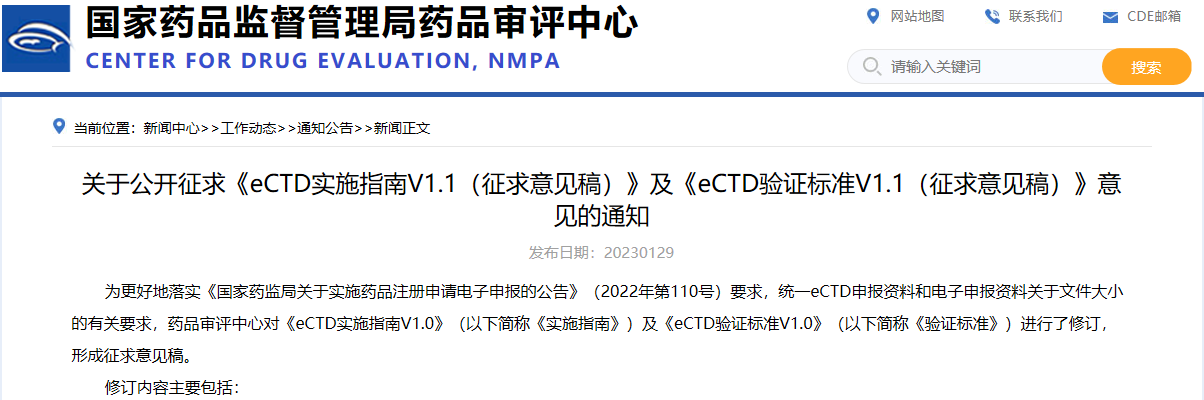 關(guān)于公開征求《eCTD實施指南V1.1(征求意見稿)》及《eCTD驗證標準V1.1(征求意見稿)》意見的通知