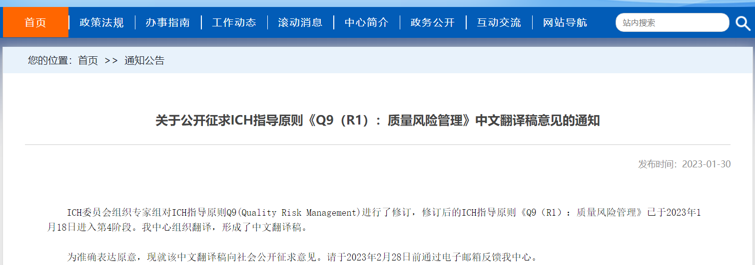 關(guān)于公開征求ICH指導(dǎo)原則《Q9(R1):質(zhì)量風(fēng)險管理》中文翻譯稿意見的通知