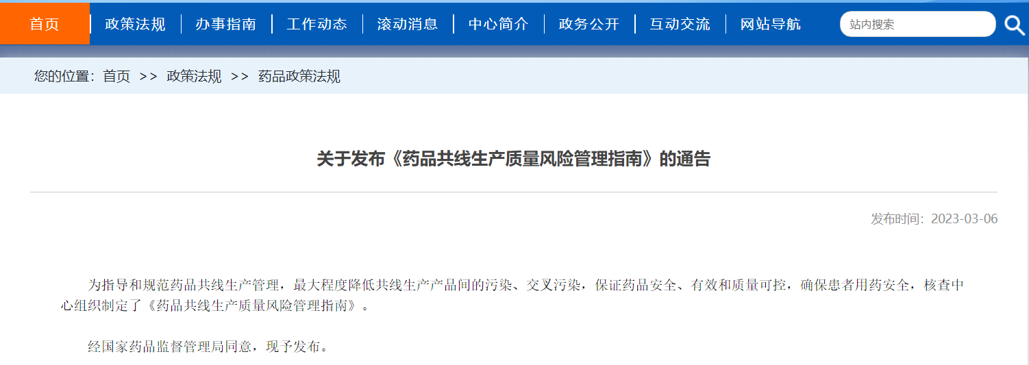 國家藥監局核查中心關于發布《藥品共線生產質量風險管理指南》的通告