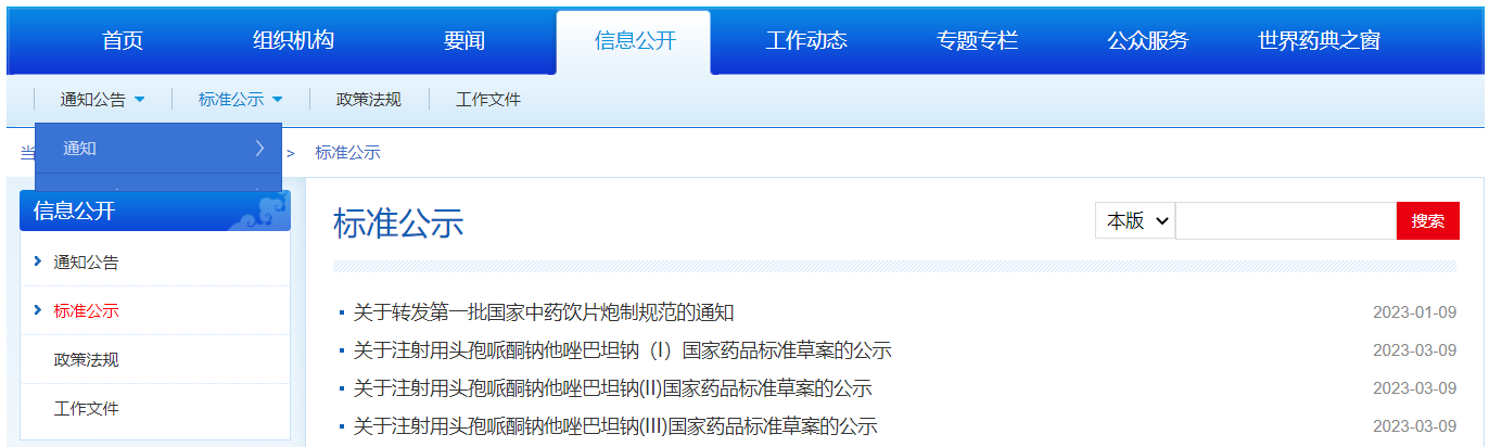 發布注射用頭孢哌酮鈉他唑巴坦鈉(I)、注射用頭孢哌酮鈉他唑巴坦鈉(II)、注射用頭孢哌酮鈉他唑巴坦鈉(III)國家藥品標準草案的公示。