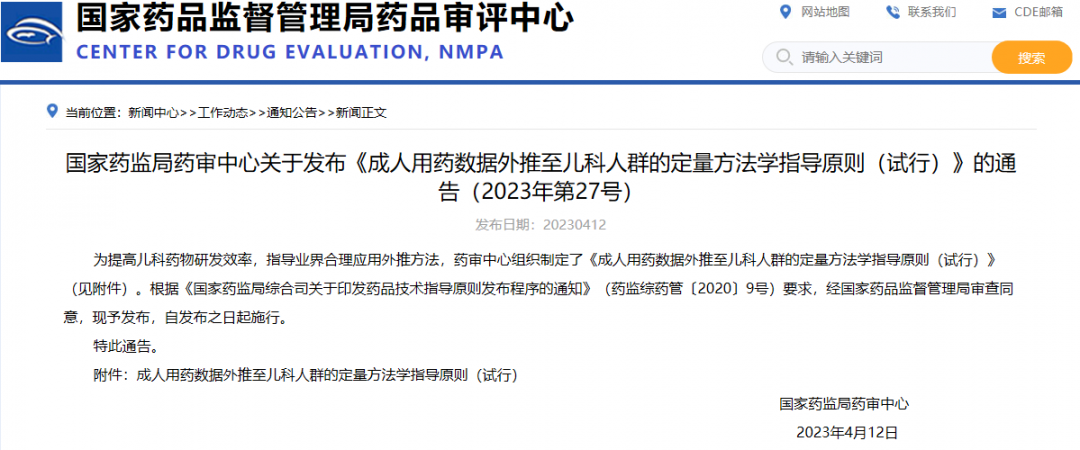 國家藥監(jiān)局藥審中心關(guān)于發(fā)布《成人用藥數(shù)據(jù)外推至兒科人群的定量方法學(xué)指導(dǎo)原則(試行)》的通告(2023年第27號)
