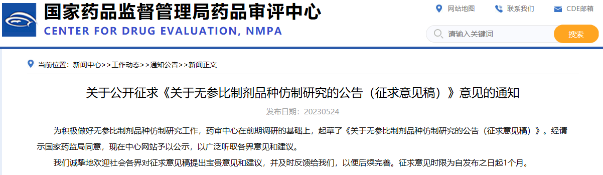關于公開征求《關于無參比制劑品種仿制研究的公告(征求意見稿)》意見的通知