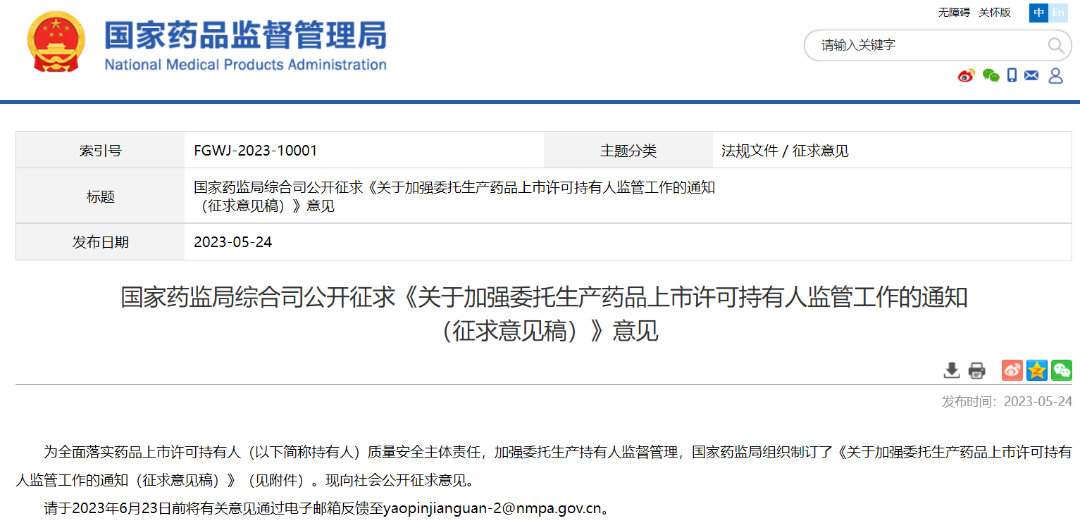 國家藥監局綜合司公開征求《關于加強委托生產藥品上市許可持有人監管工作的通知(征求意見稿)》意見