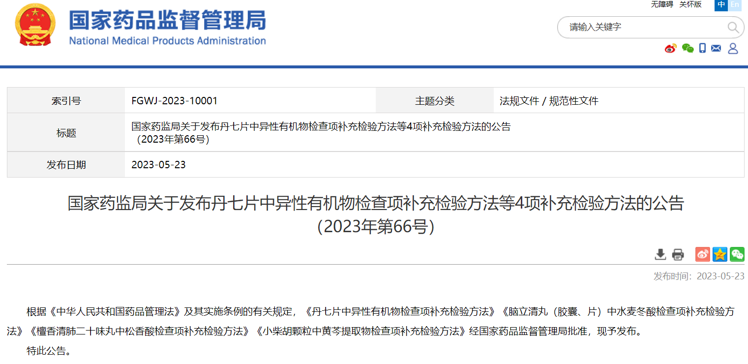 國家藥監局關于發布丹七片中異性有機物檢查項補充檢驗方法等4項補充檢驗方法的公告(2023年第66號)