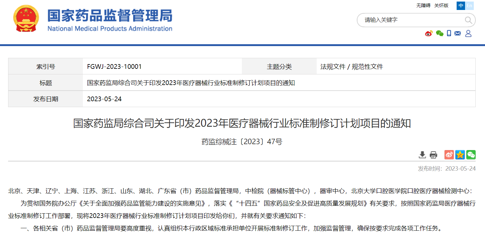 國家藥監局綜合司關于印發2023年醫療器械行業標準制修訂計劃項目的通知