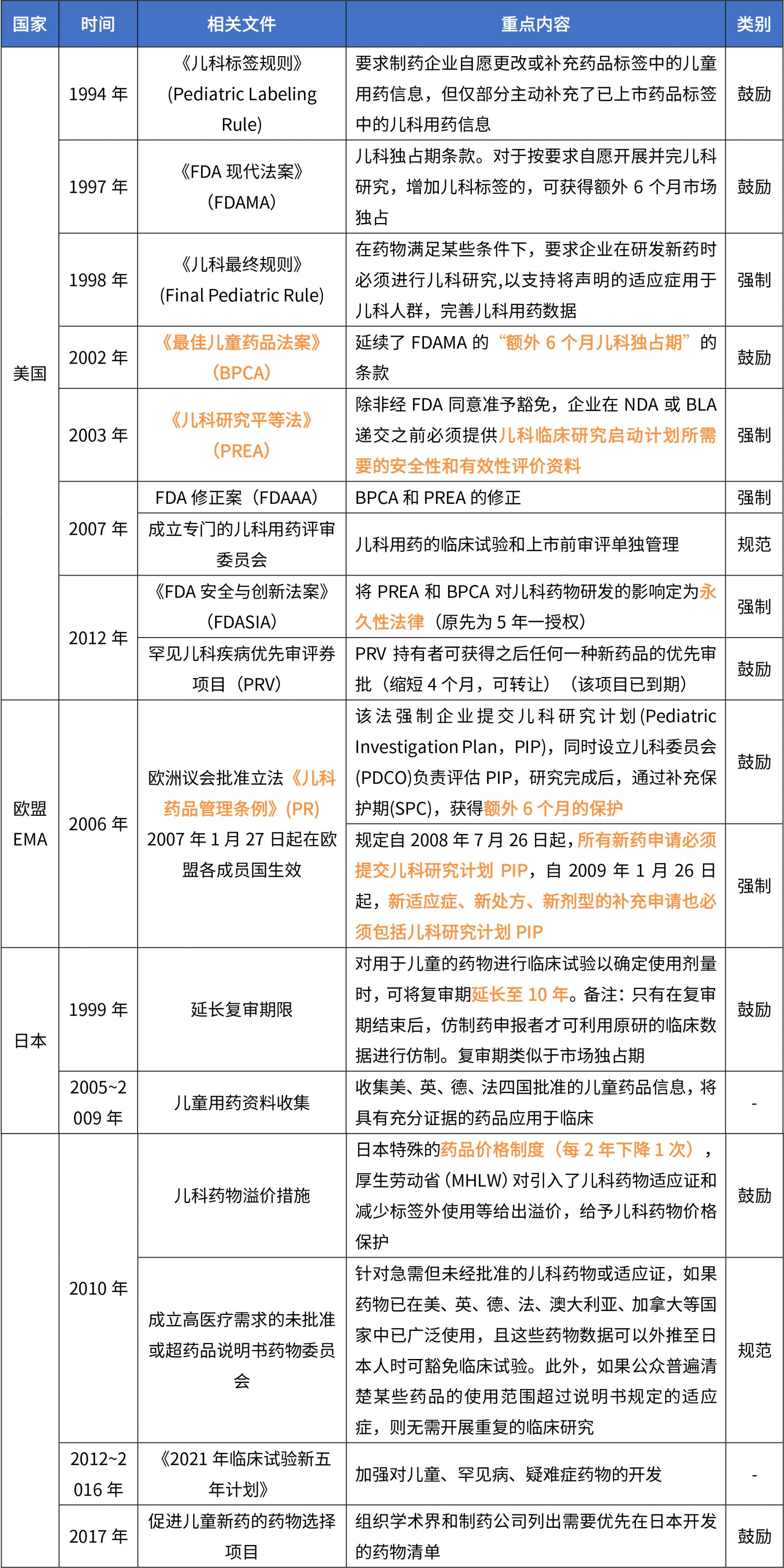 歐美日是兒科用藥政策先行者,美國、歐盟都具有專門的的兒童用藥立法,采用鼓勵+強制結合的協同策略促進兒童新藥的開發、兒童臨床試驗的管理等。日本也通過制定各種法規來鼓勵規兒藥開發。各國項目兒藥法規內容見下表。