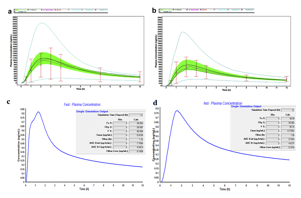 說明:a和b參考文獻中案例2軟件模擬和預測值,c和d是小編建模模擬值,分析由于數據信息欠缺與文獻值有差異,但是小編模擬結果也表明化合物2表現出明顯的正向食物效應。