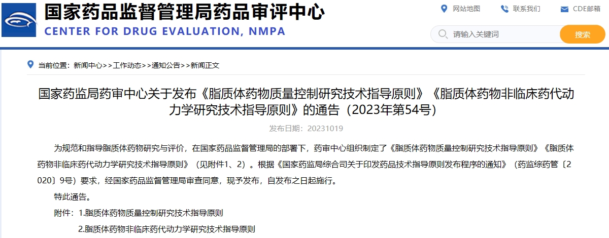 國家藥監(jiān)局藥審中心關(guān)于發(fā)布《脂質(zhì)體藥物質(zhì)量控制研究技術(shù)指導(dǎo)原則》《脂質(zhì)體藥物非臨床藥代動力學(xué)研究技術(shù)指導(dǎo)原則》的通告(2023年第54號)