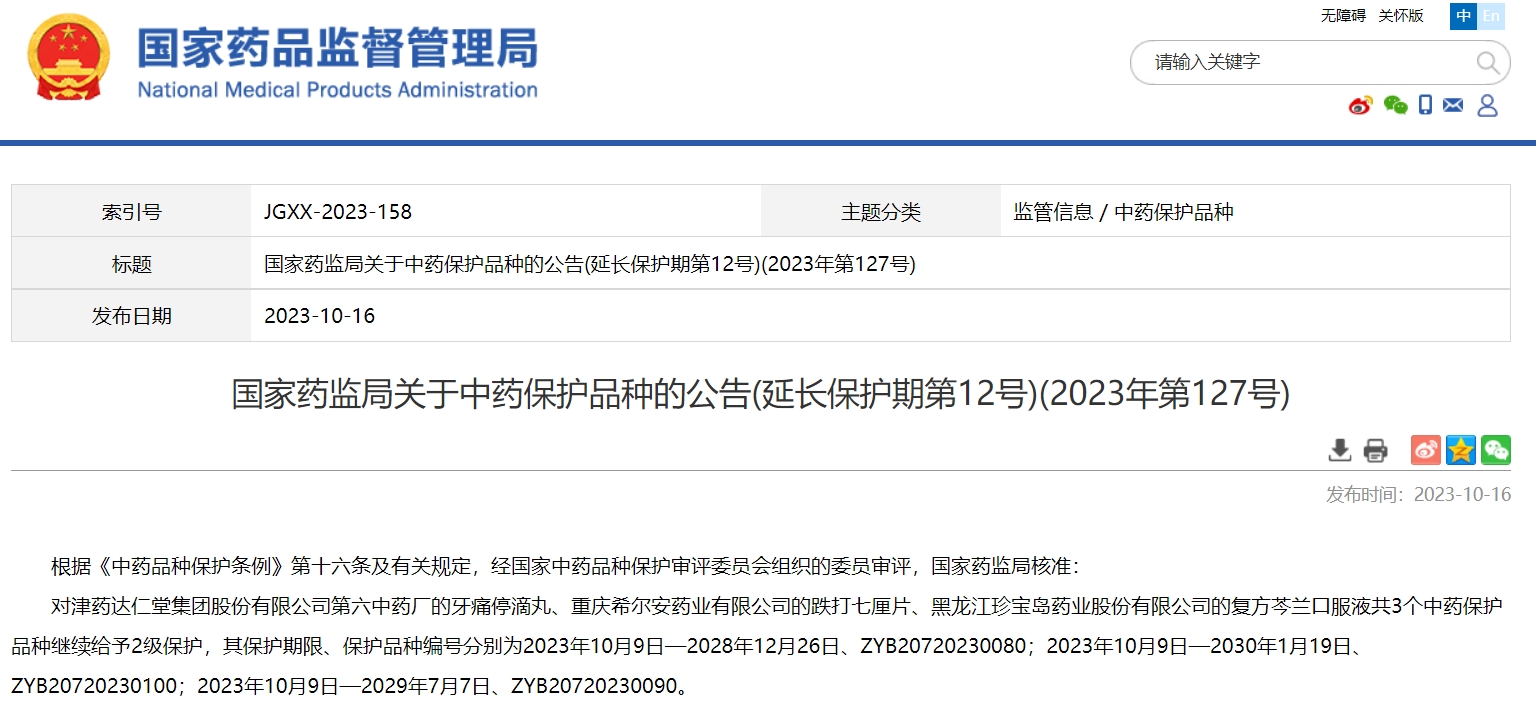 國家藥監(jiān)局關(guān)于中藥保護(hù)品種的公告(延長保護(hù)期第12號)(2023年第127號)