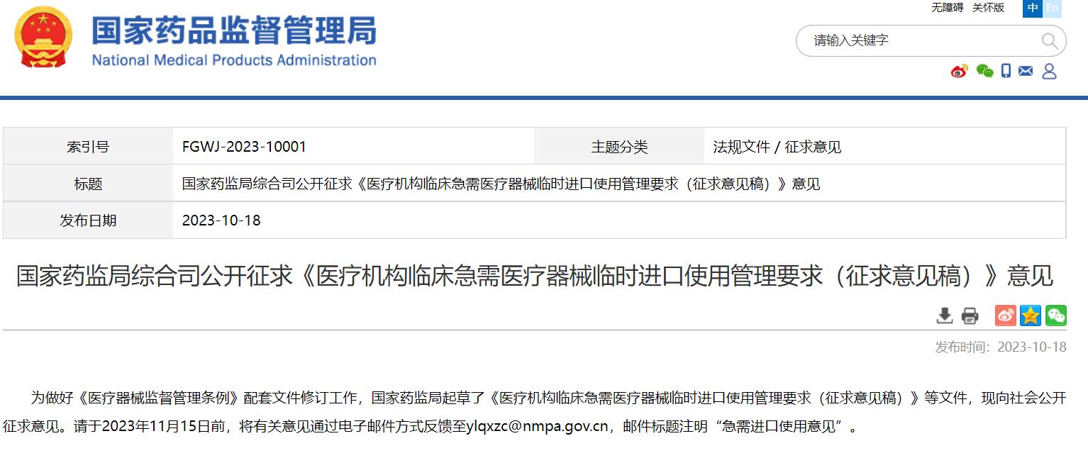 國家藥監(jiān)局綜合司公開征求《醫(yī)療機(jī)構(gòu)臨床急需醫(yī)療器械臨時進(jìn)口使用管理要求(征求意見稿)》意見