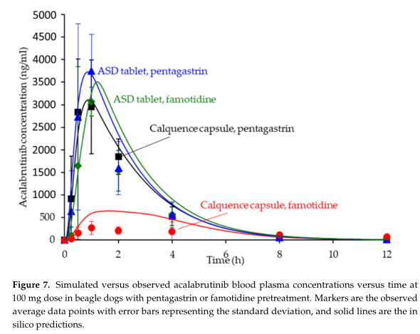文章中模擬固體分散體片和Calquence膠囊同法莫替?。╢amotidine,ARAs)、五肽胃泌素(pentagastrin)服用血藥濃度時(shí)間曲線如下: