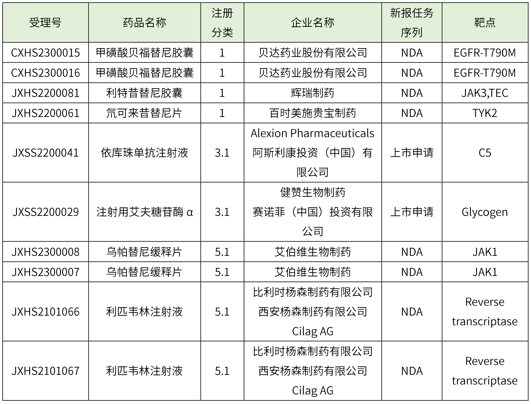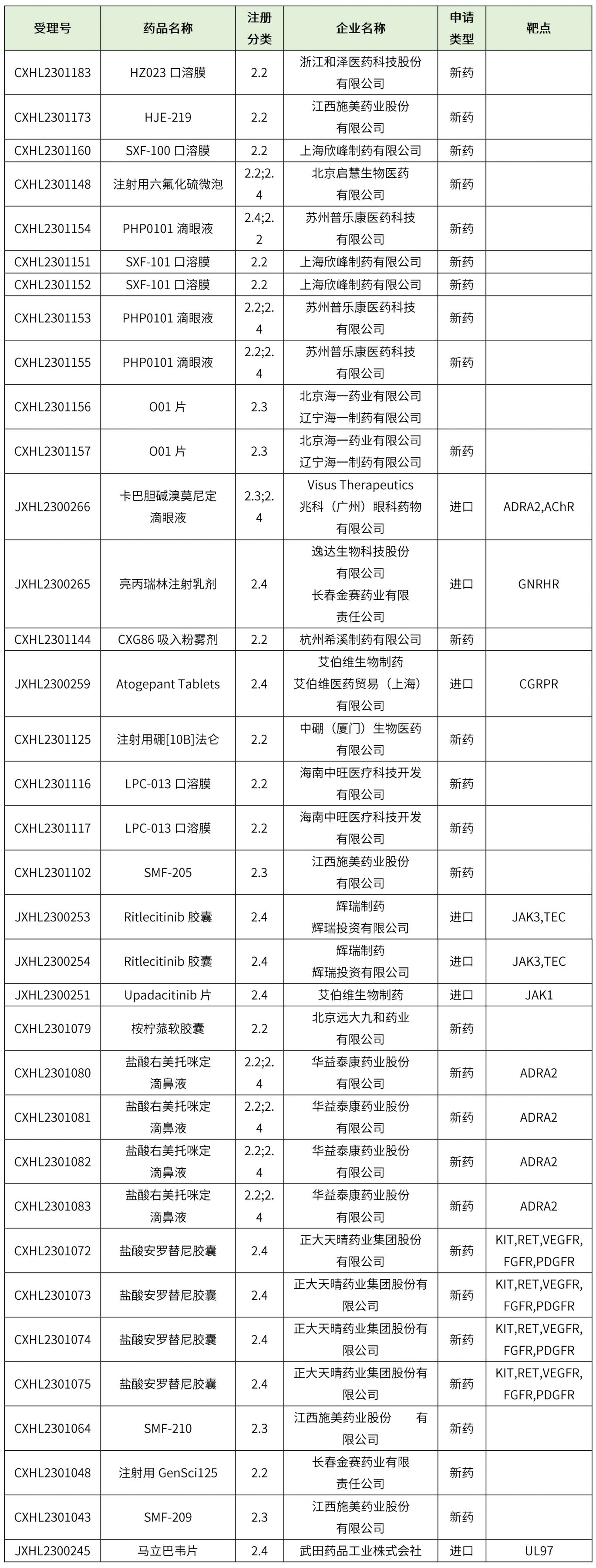 化學藥品1類3個(甲磺酸貝福替尼膠囊、利特昔替尼膠囊、氘可來昔替尼片),5.1類2個(烏帕替尼緩釋片、利匹韋林注射液),藥物詳細信息見下表。