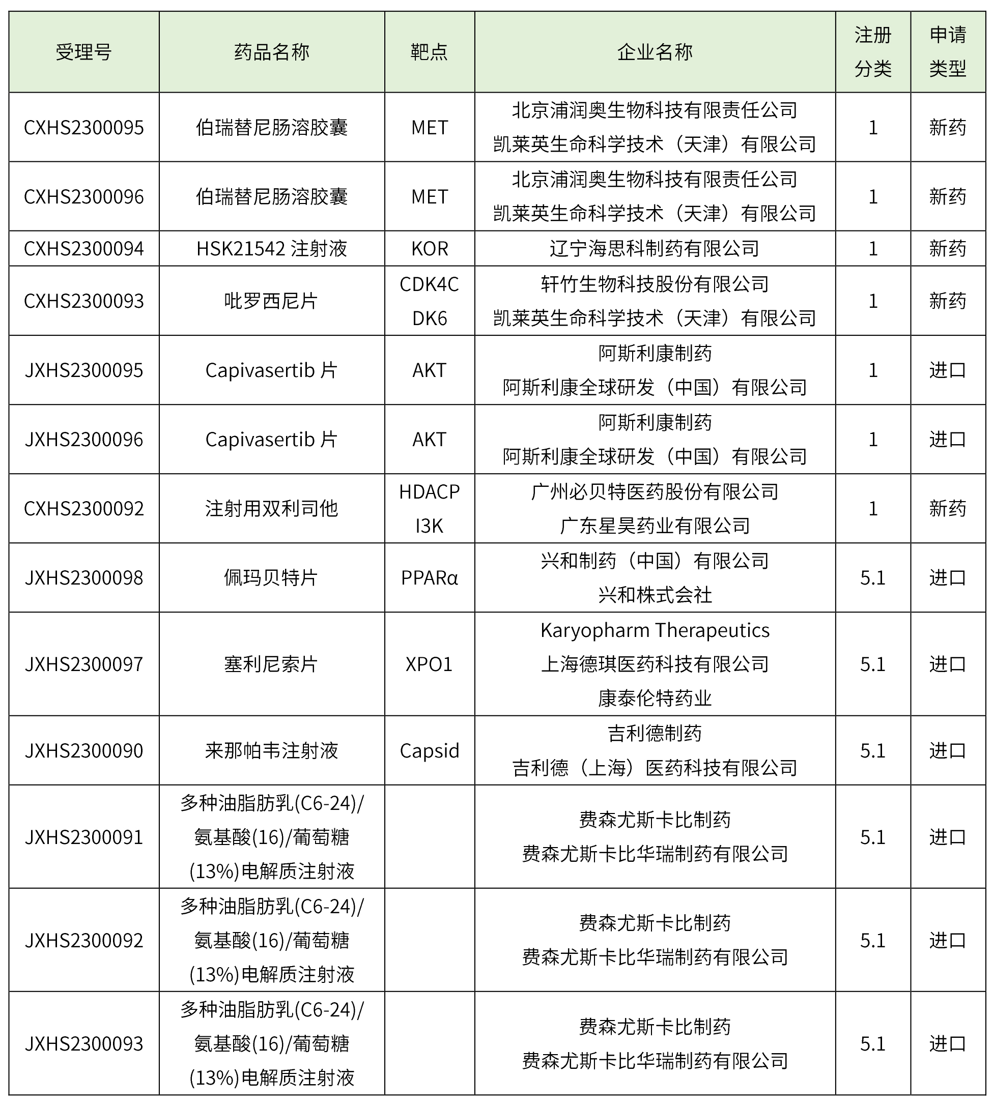 化藥9個(伯瑞替尼腸溶膠囊、HSK21542注射液、吡羅西尼片、Capivasertib片、注射用雙利司他、佩瑪貝特片、塞利尼索片、來那帕韋注射液、多種油脂肪乳(C6-24)/氨基酸(16)/葡萄糖(13%)電解質注射液),藥物詳細信息見下表。