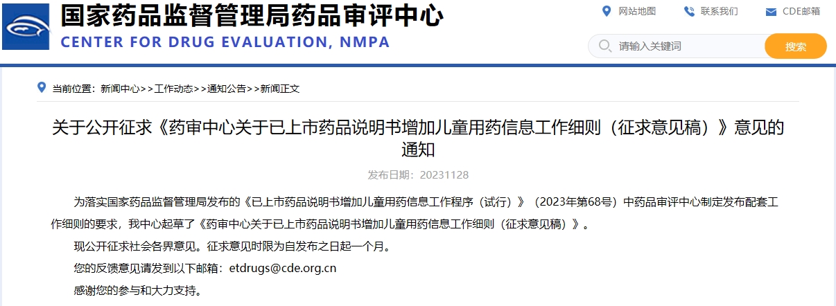 政策法規 ||公開征求《藥審中心關于已上市藥品說明書增加兒童用藥信息工作細則(征求意見稿)》(附法規概覽11.27-12.01)