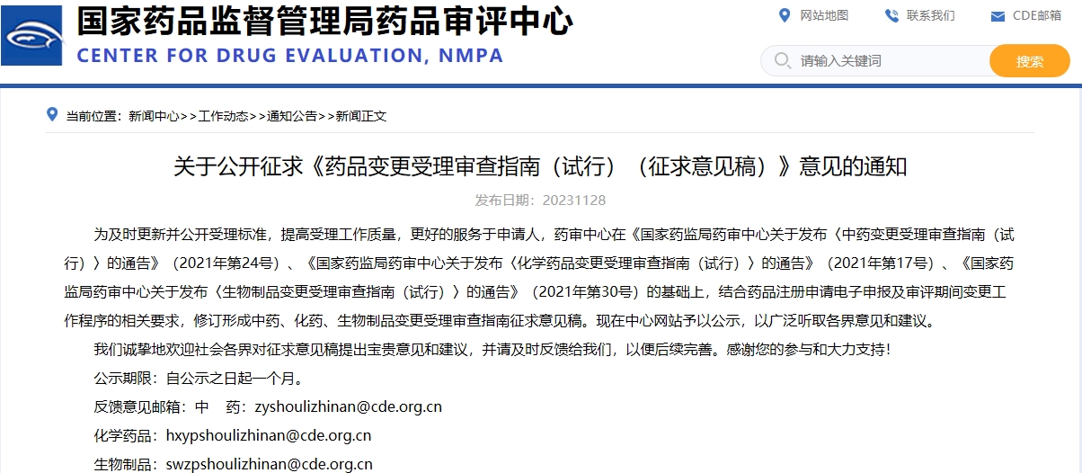 關于公開征求《藥品變更受理審查指南(試行)(征求意見稿)》意見的通知