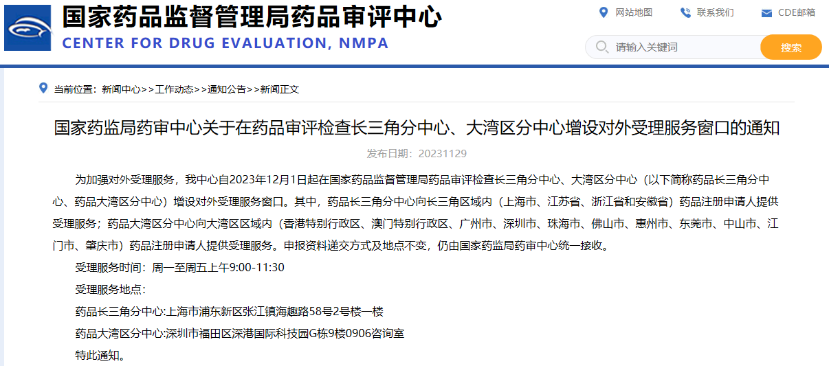 國家藥監局藥審中心關于在藥品審評檢查長三角分中心、大灣區分中心增設對外受理服務窗口的通知