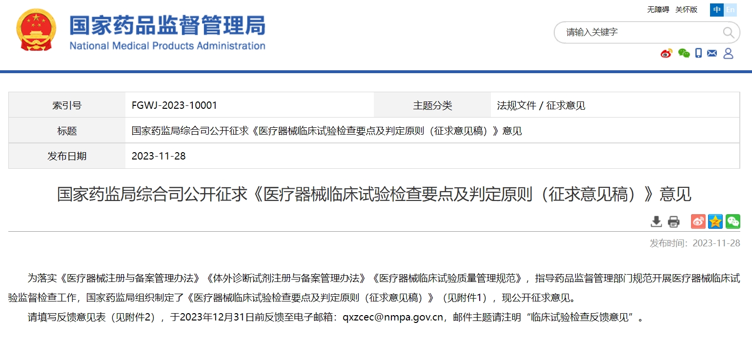 國家藥監局綜合司公開征求《醫療器械臨床試驗檢查要點及判定原則(征求意見稿)》意見