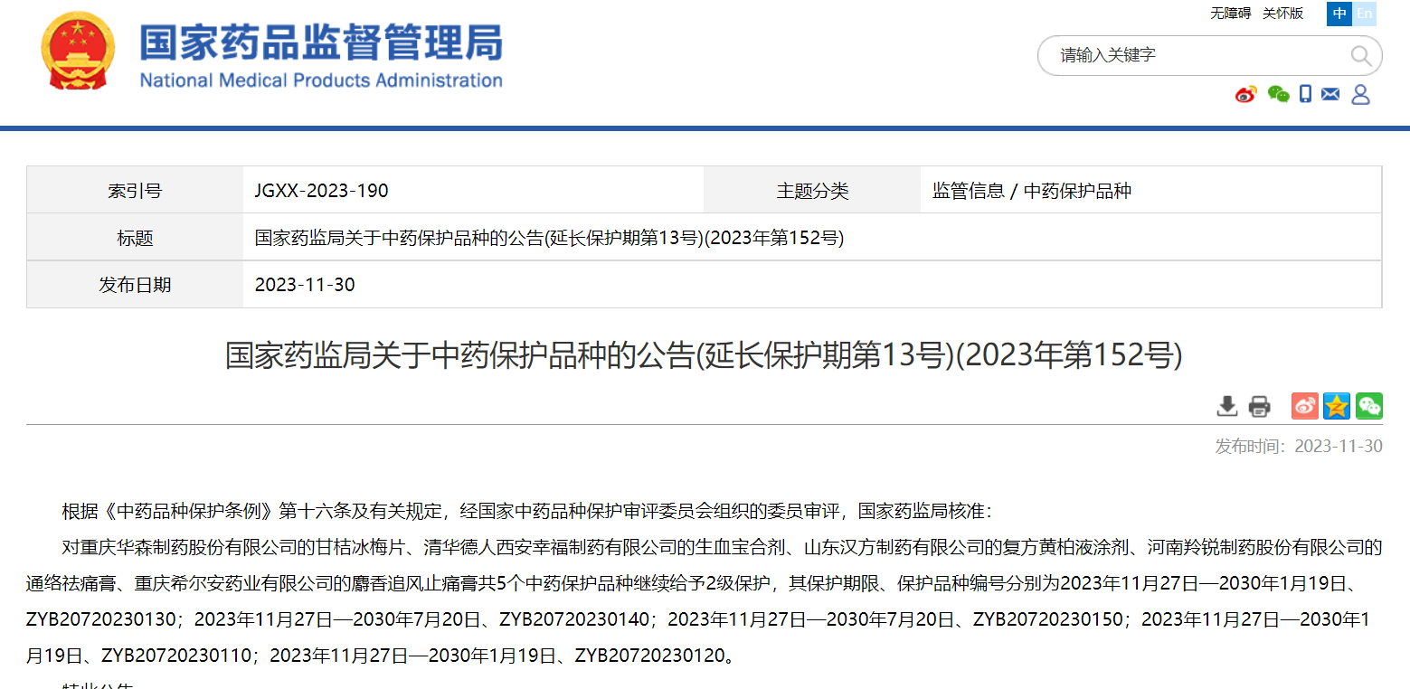 國家藥監局關于中藥保護品種的公告(延長保護期第13號)(2023年第152號)
