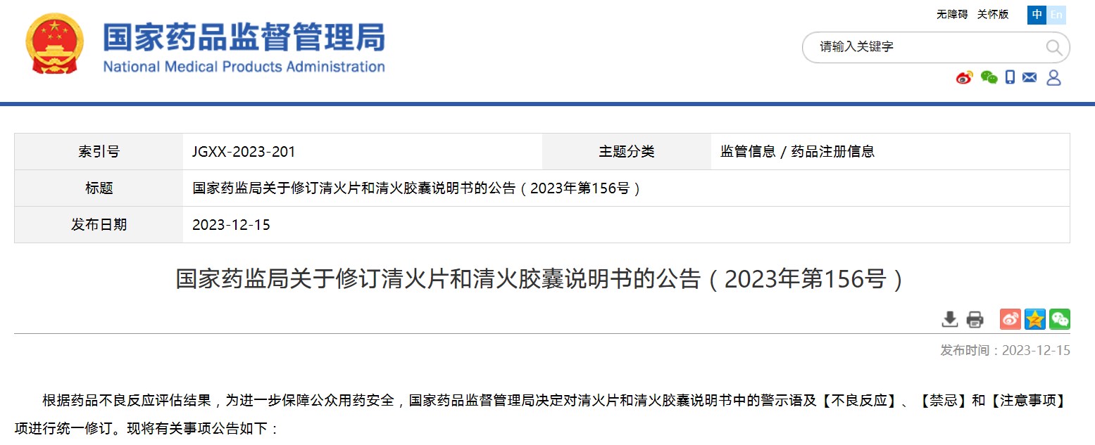 國家藥監局關于修訂清火片和清火膠囊說明書的公告(2023年第156號)