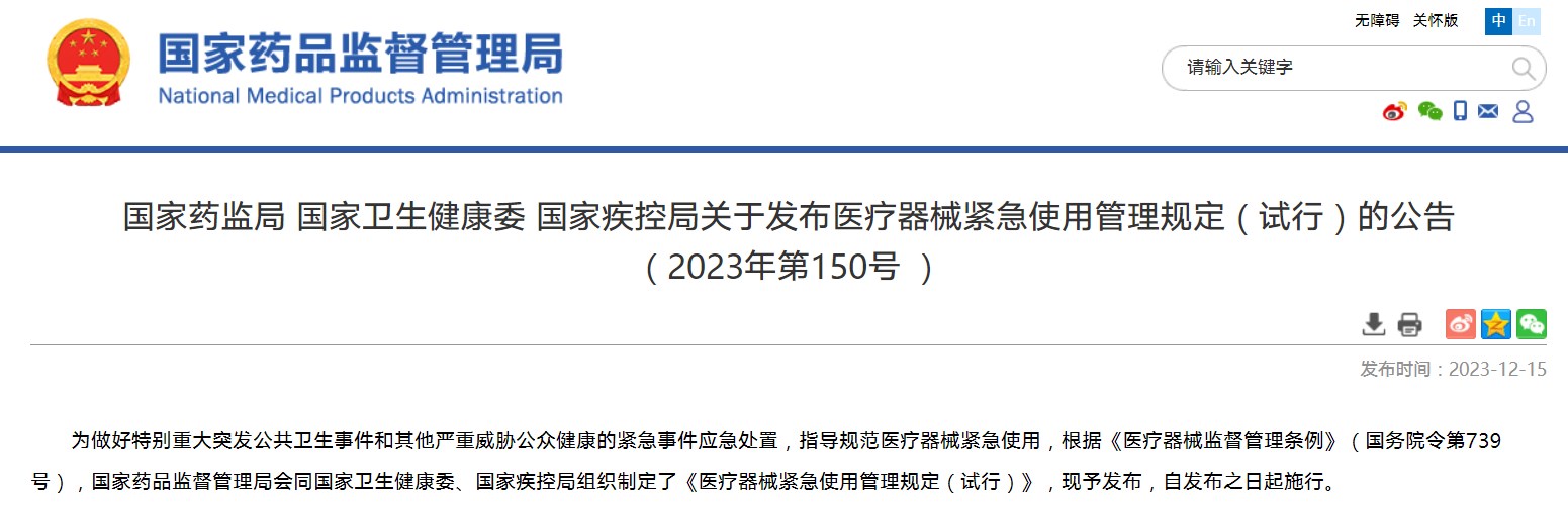 國家藥監局 國家衛生健康委 國家疾控局關于發布醫療器械緊急使用管理規定(試行)的公告(2023年第150號 )