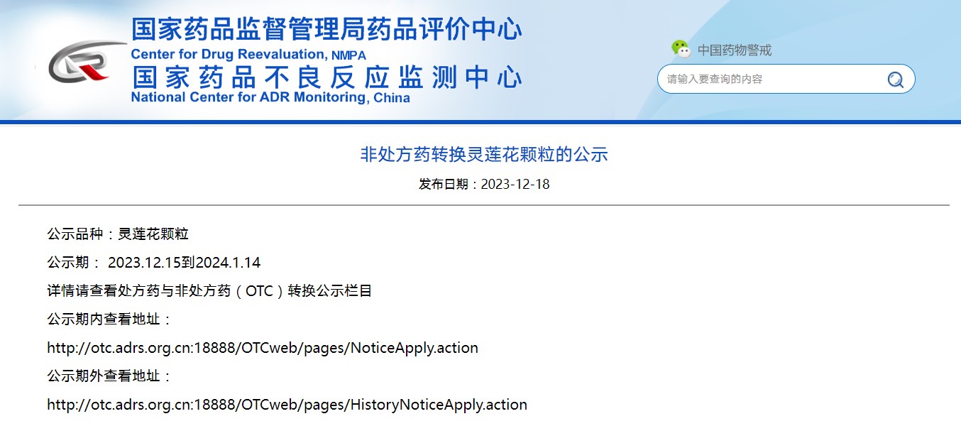 非處方藥轉(zhuǎn)換靈蓮花顆粒的公示