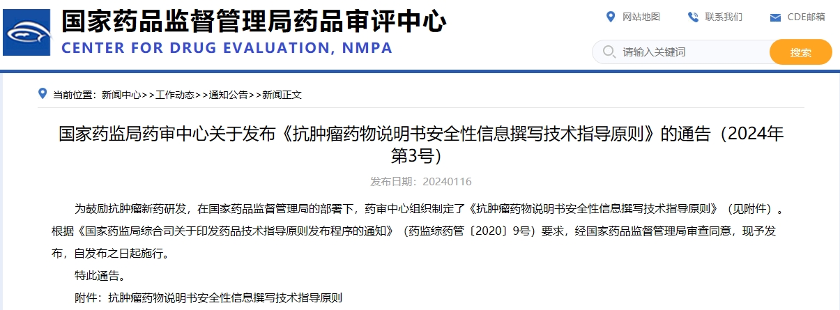 國家藥監局藥審中心關于發布《抗腫瘤藥物說明書安全性信息撰寫技術指導原則》的通告(2024年第3號)
