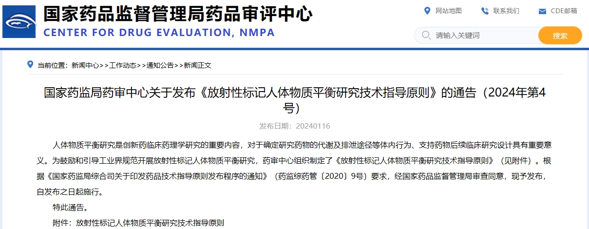 國家藥監局藥審中心關于發布《放射性標記人體物質平衡研究技術指導原則》的通告(2024年第4號)