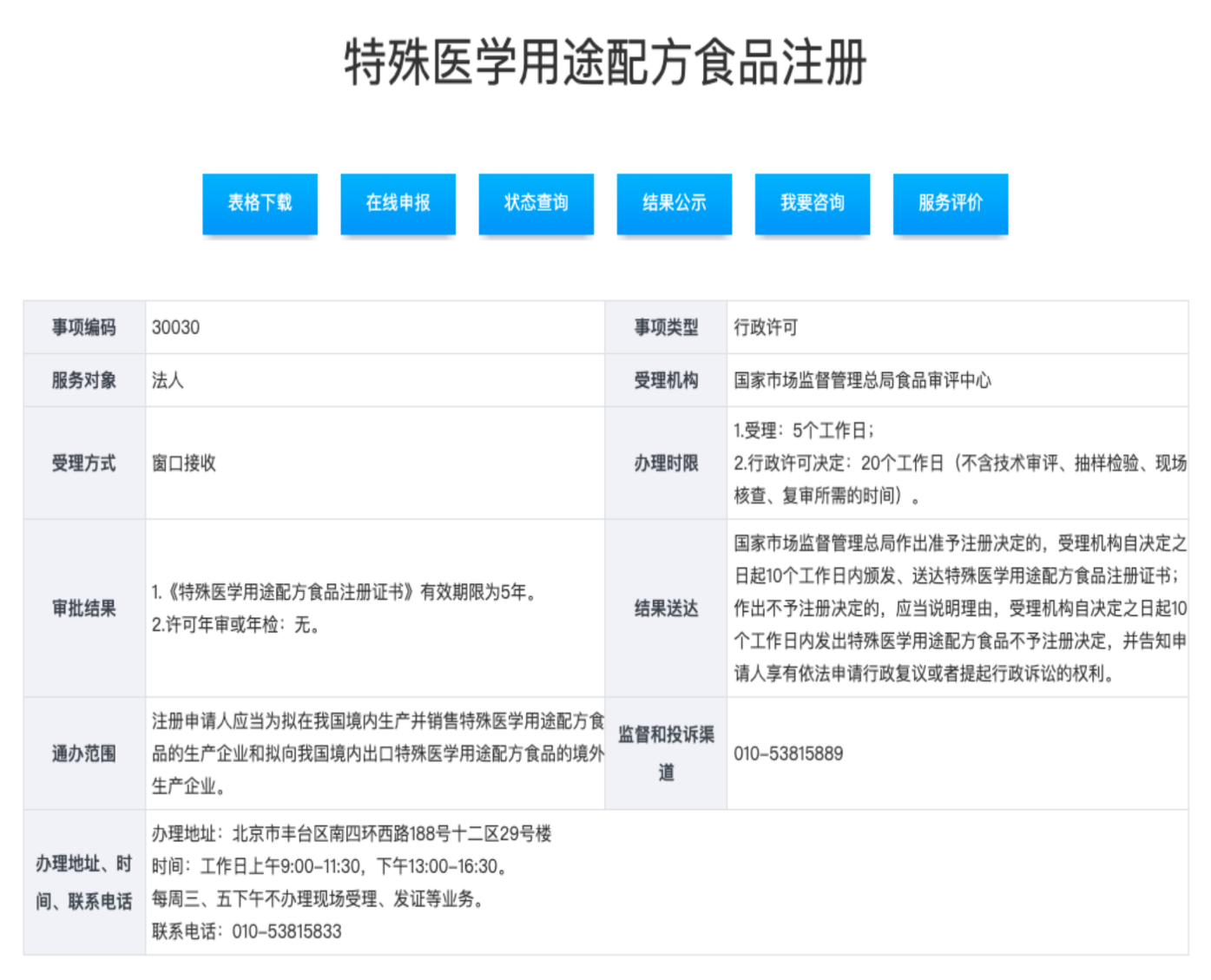 國家市場監督管理總局SAMR食品審評機構承擔特殊醫學用途配方食品注冊申請的受理、審評等工作。可登錄網站進行線上注冊申報。網址:https://tyspzc.gsxt.gov.cn/stzcww/login/loginAction!login.dhtml