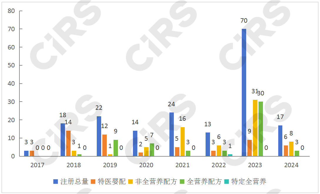 自2017年第一款特醫嬰配產品注冊成功后,特醫食品注冊大門正式打開。下圖可知,特醫嬰配呈現高開低走的趨勢,其注冊主要集中于2018年和2019年,非全營養配方的注冊則集中于2021和2023年。2022年總注冊量較少,但注冊產品類型增多,且新增了首款特定全營養配方食品。2023年新增了首款增稠組件,注冊類型主要集中于全營養和非全營養產品,其占比高達87%。相比2022年注冊量,2023年呈現爆發式增長。2024年第一季度已新增17款產品,由此可見2024年的產品獲批勢頭強勁,而特定全營養食品依然是需要繼續突破的大關。