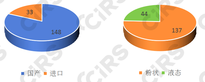 截至2024年4月1日,共計181款特醫食品注冊獲批,國產148款,進口33款,國產產品注冊數量已遠超進口產品。在已批準的181款產品中,粉狀產品居多,有137款產品的劑型為粉狀,其余44款為液態產品。