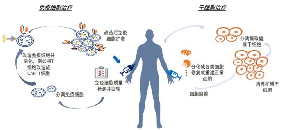 細胞治療是指應用人自體或異體來源的細胞經體外操作后輸入(或植入)人體,用于疾病治療的過程。體外操作包括但不限于分離、純化、培養、擴增、活化、細胞(系)的建立、凍存復蘇等。細胞治療主要可分為免疫細胞治療、干細胞治療和其它體細胞治療。