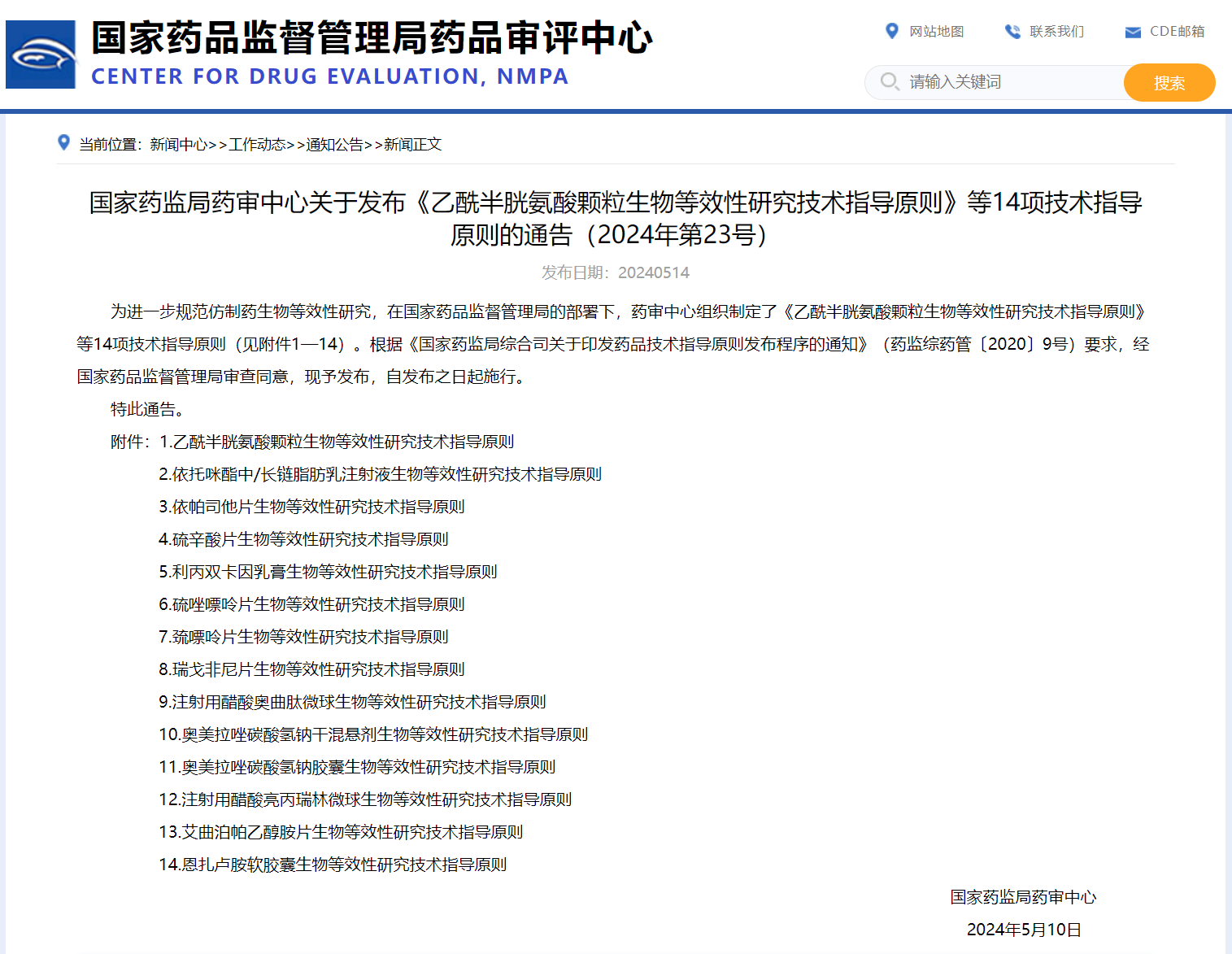 國家藥監局藥審中心關于發布《乙酰半胱氨酸顆粒生物等效性研究技術指導原則》等14項技術指導原則的通告(2024年第23號)