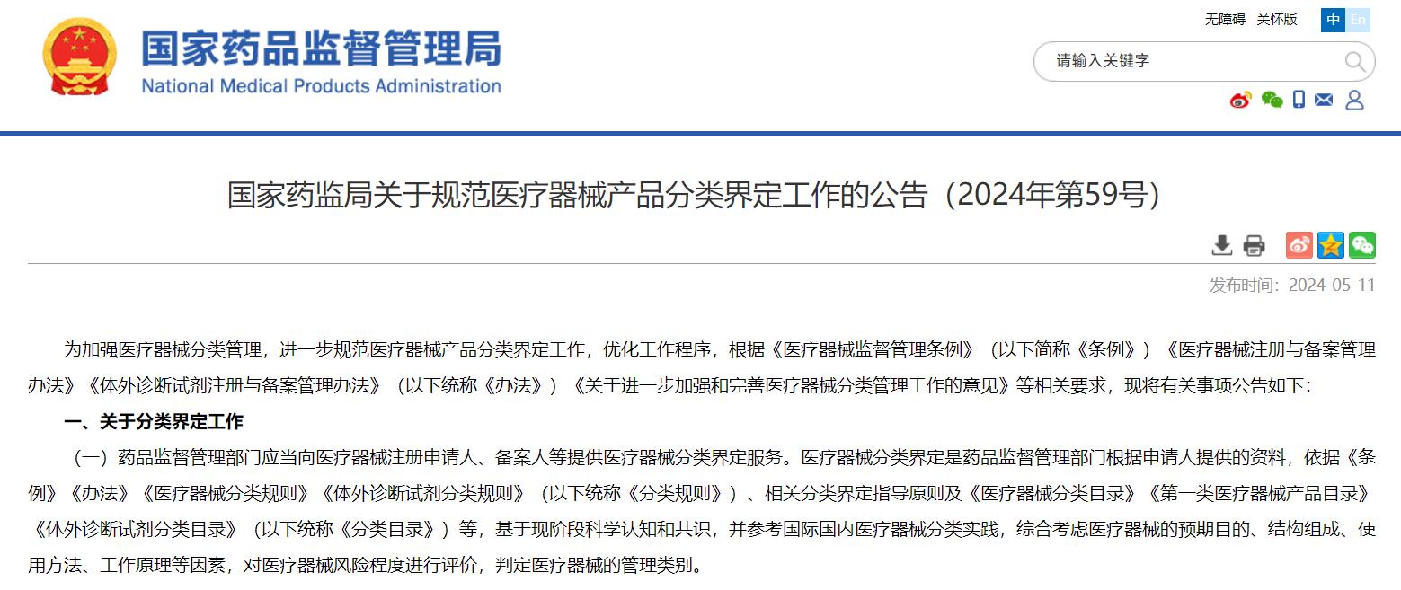 國家藥監局關于規范醫療器械產品分類界定工作的公告(2024年第59號)