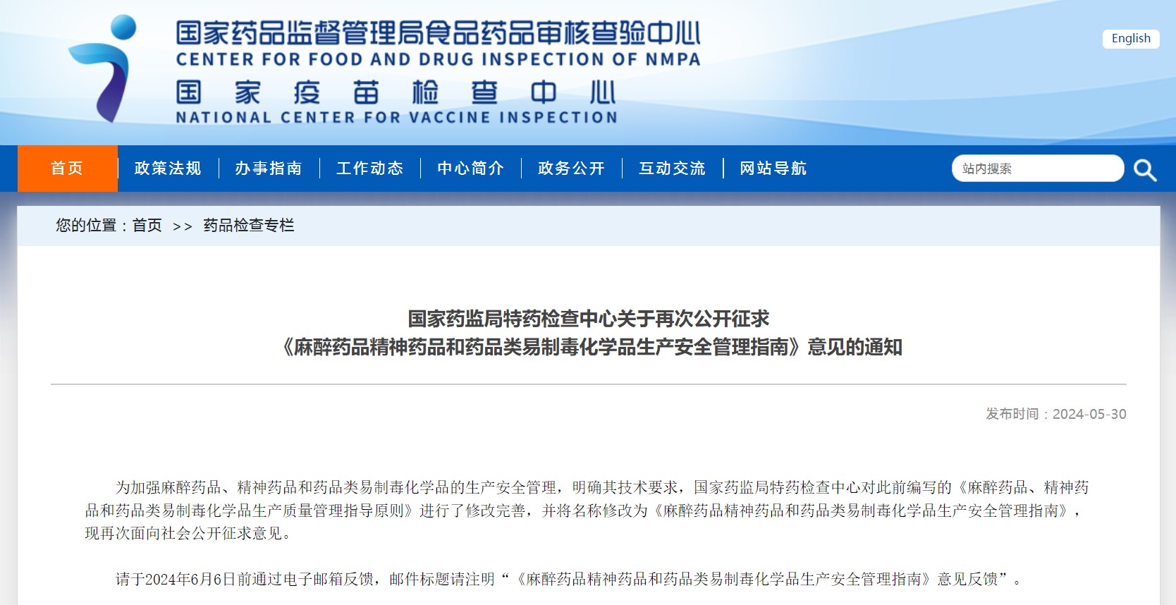 國家藥監局特藥檢查中心關于再次公開征求 《麻醉藥品精神藥品和藥品類易制毒化學品生產安全管理指南》意見的通知