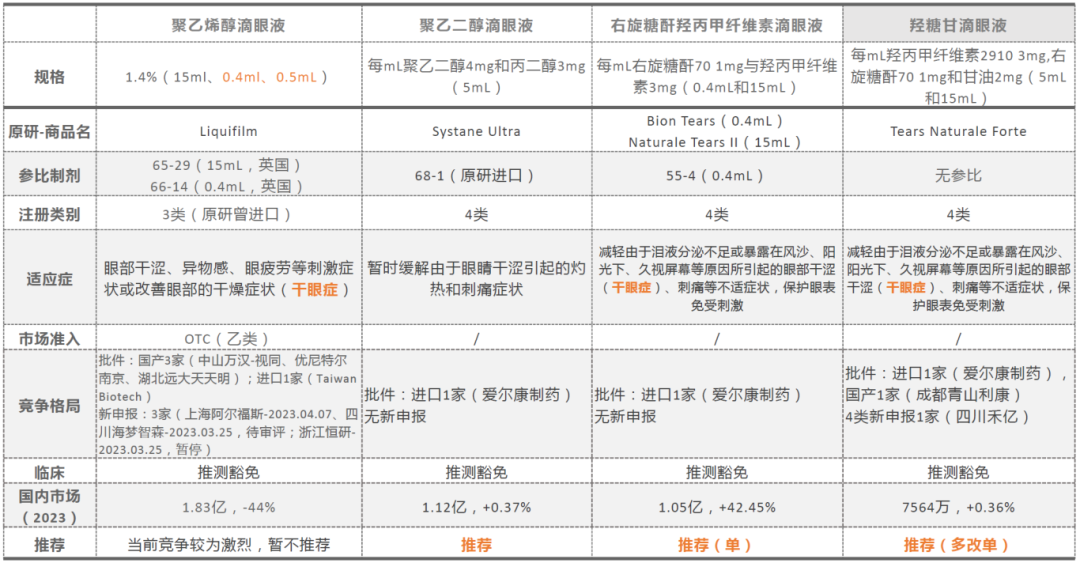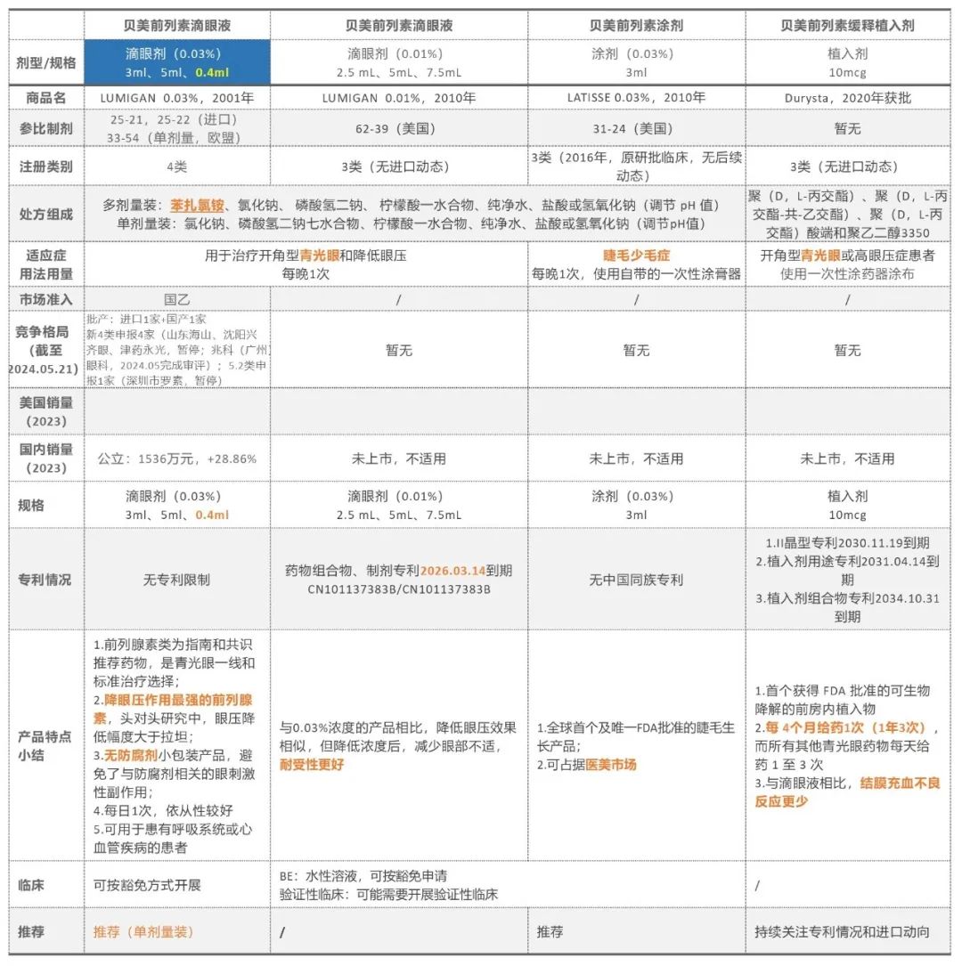 建議開發(fā)單劑量裝0.03%滴眼液、改善安全性的0.01%滴眼液、醫(yī)美涂劑,持續(xù)關注植入劑進口動向和專利情況。