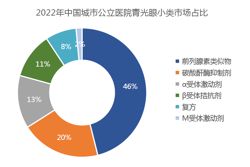 抗青光眼藥物可分為5類,作為一線治療藥物的前列腺素類似物在2022年以46%的比例主導市場,碳酸酐酶抑制劑、β腎上腺素拮抗劑、α腎上腺素能受體激動劑、復方制劑分別占20%、13%、11%和8%的市場份額。