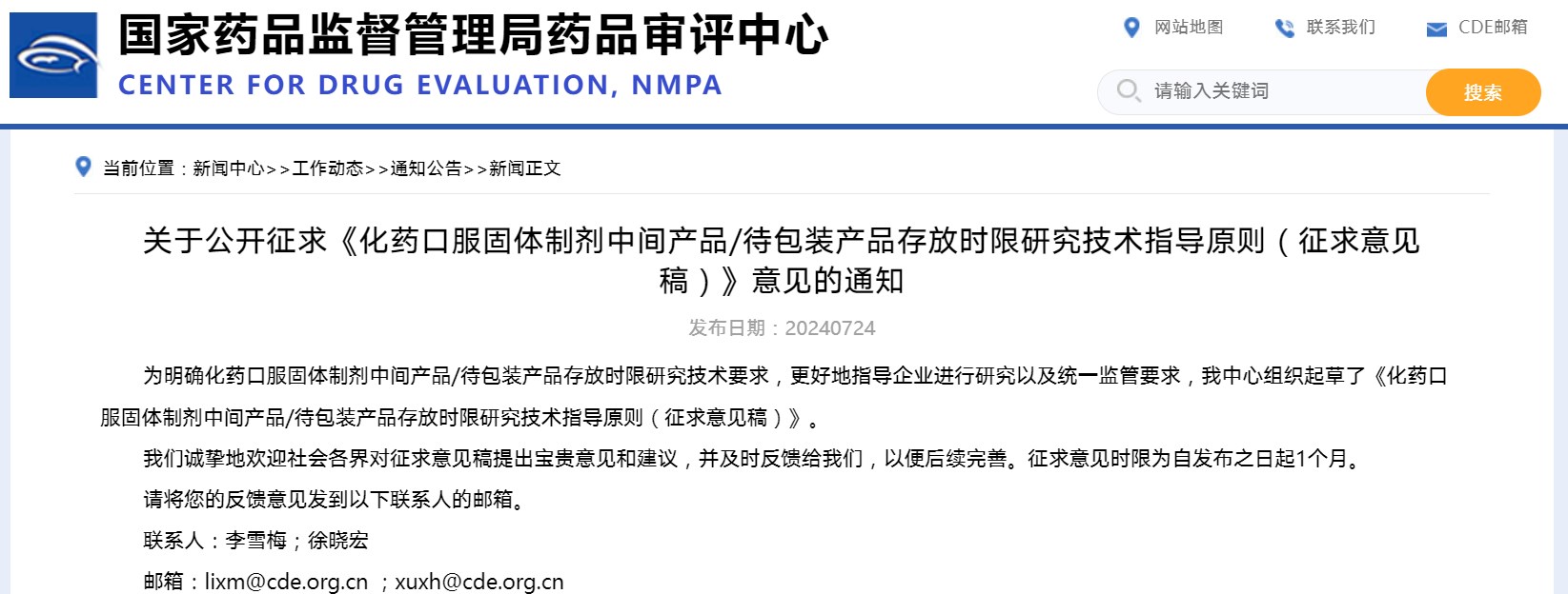 關于公開征求《化藥口服固體制劑中間產(chǎn)品/待包裝產(chǎn)品存放時限研究技術指導原則(征求意見稿)》意見的通知