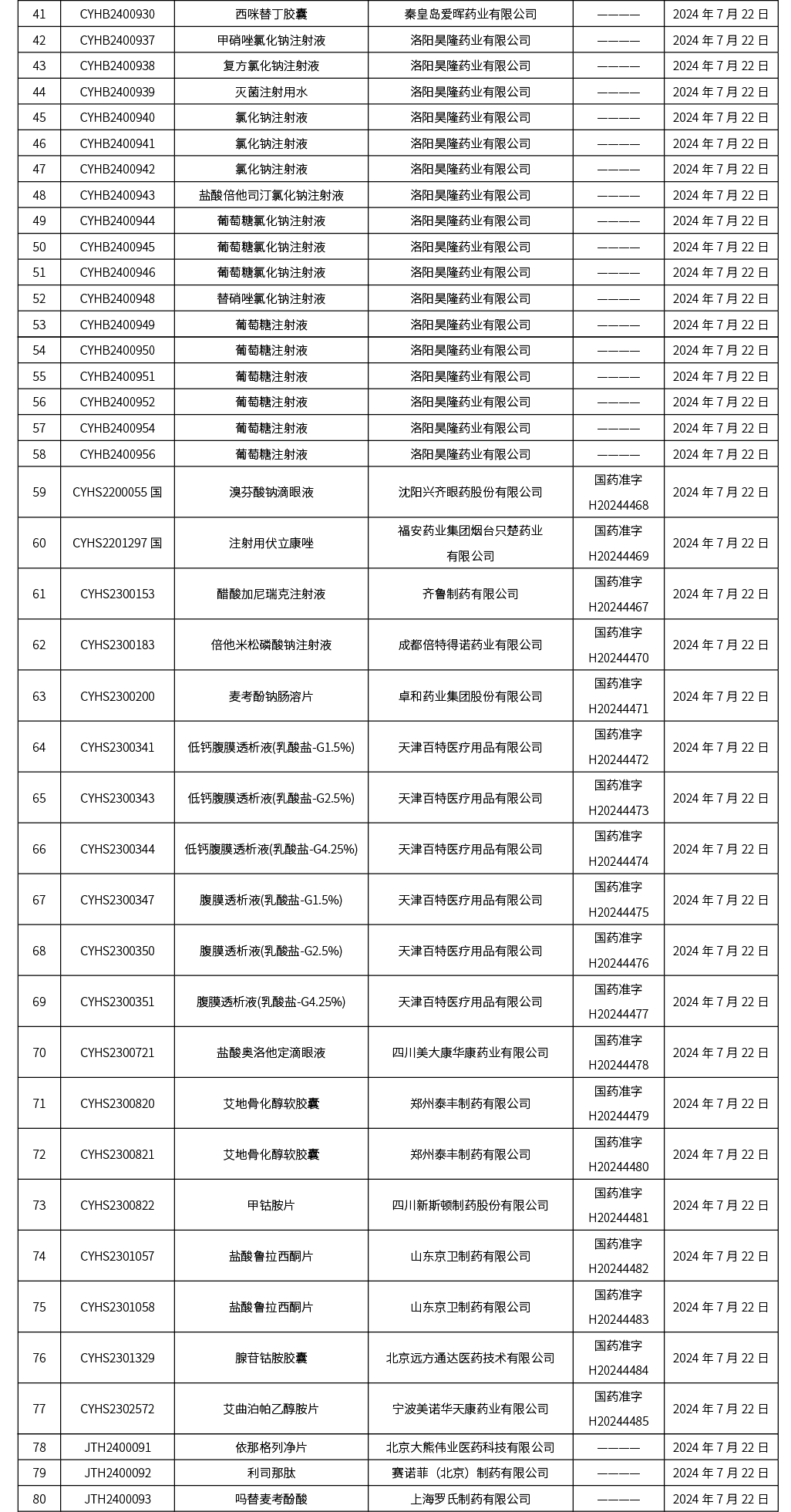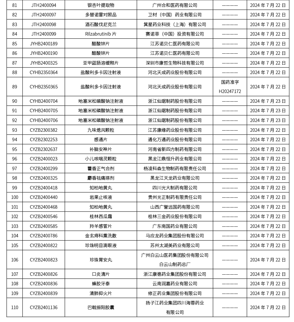 截至2024年7月26日 15:00, 發(fā)布110個待領取藥品批準證明文件,其中注射液41個,一致性評價品種19個。