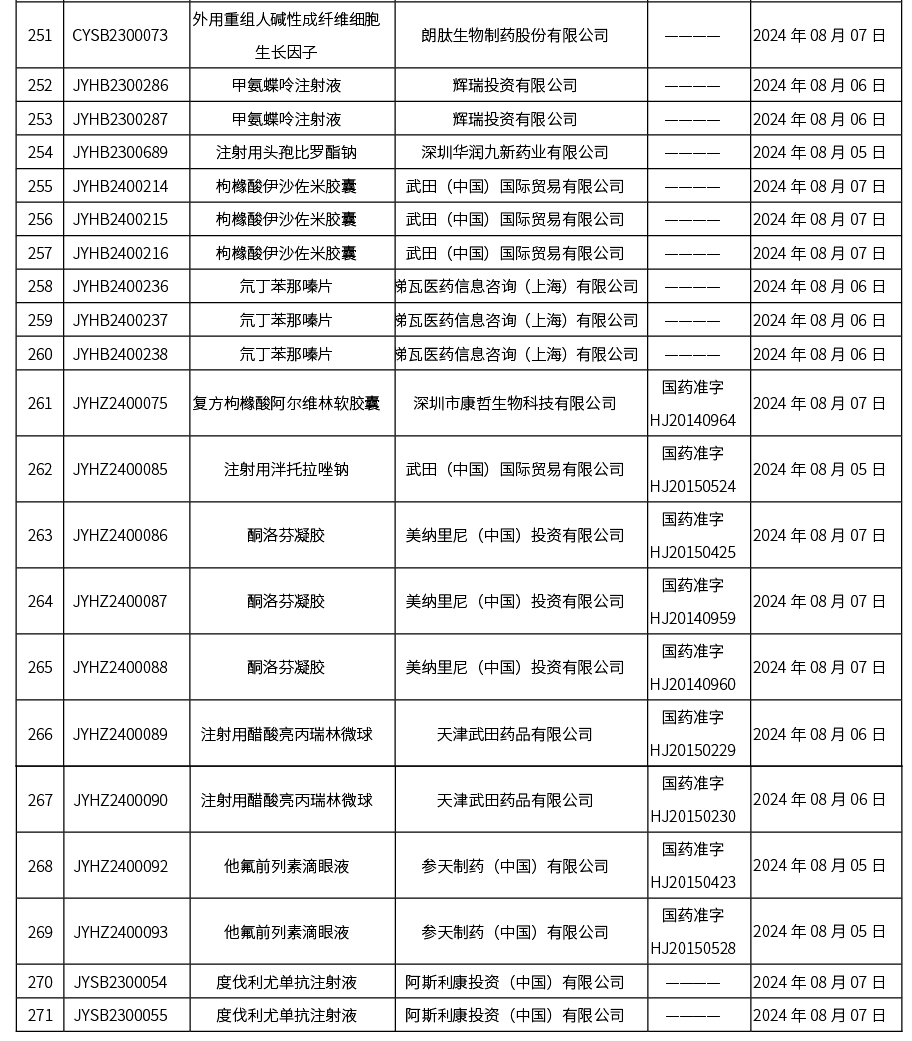 本周(截至2024年8月09日15:00),共發布藥品批準證明文件送達信息271個,其中一致性評價38個,注射劑118個。