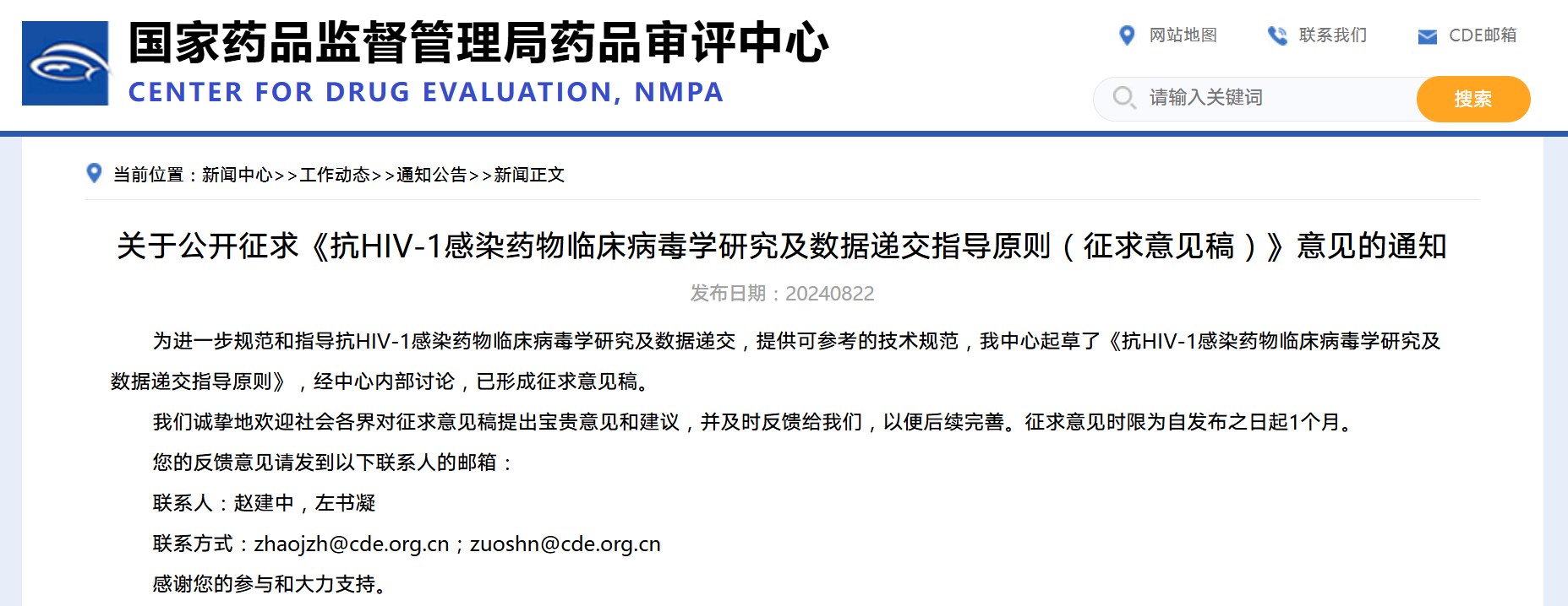 關于公開征求《抗HIV-1感染藥物臨床病毒學研究及數據遞交指導原則(征求意見稿)》意見的通知