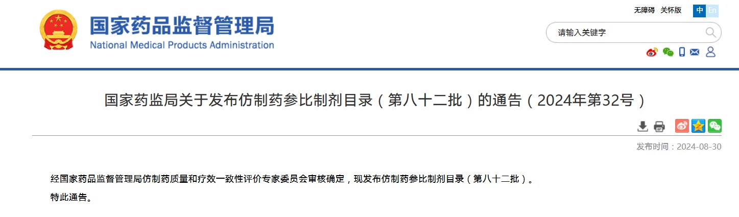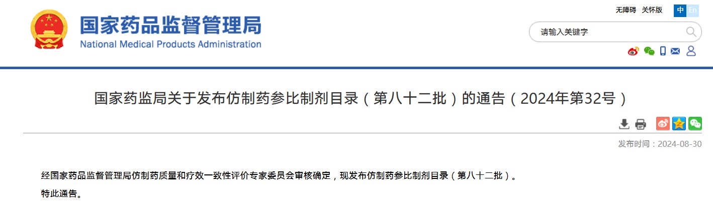 國家藥監局關于發布仿制藥參比制劑目錄(第八十二批)的通告(2024年第32號)