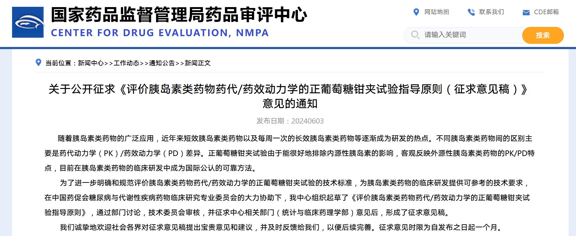 關于公開征求《評價胰島素類藥物藥代/藥效動力學的正葡萄糖鉗夾試驗指導原則(征求意見稿)》意見的通知