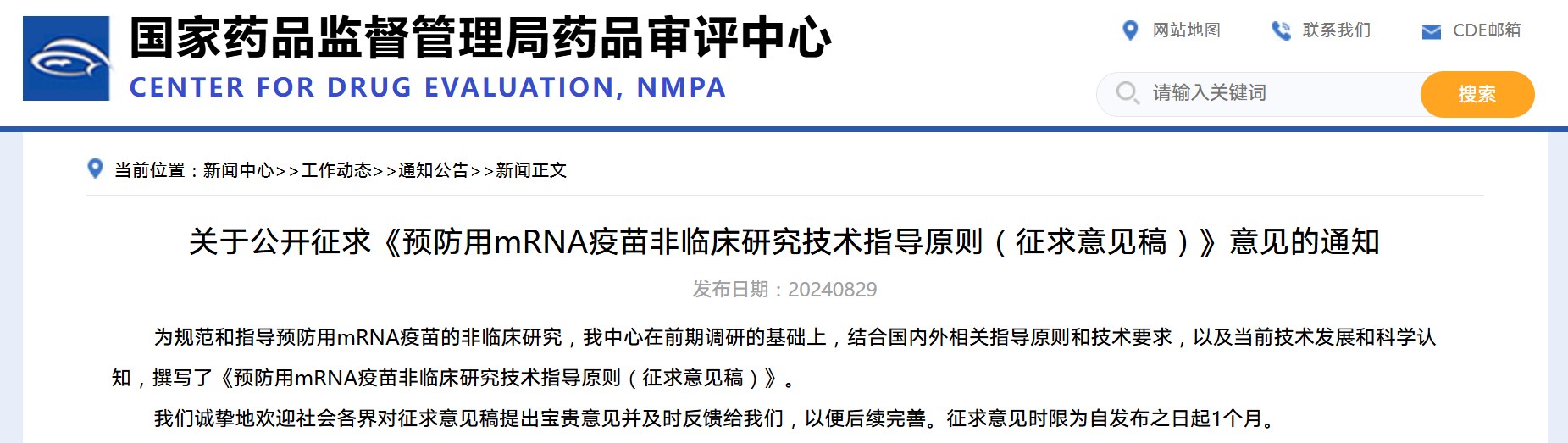 關于公開征求《預防用mRNA疫苗非臨床研究技術指導原則(征求意見稿)》意見的通知