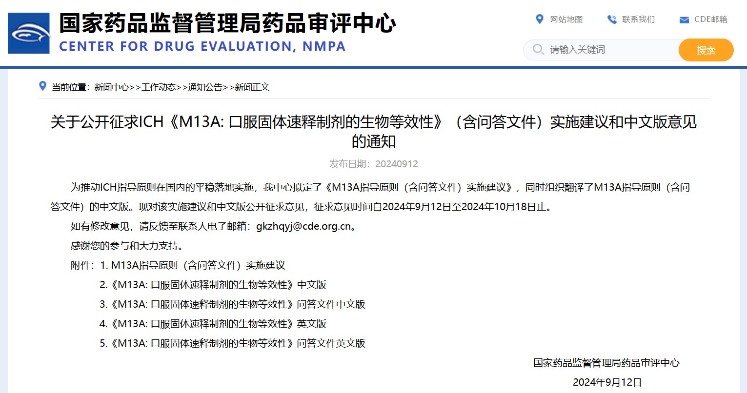 關(guān)于公開(kāi)征求ICH《M13A: 口服固體速釋制劑的生物等效性》(含問(wèn)答文件)實(shí)施建議和中文版意見(jiàn)的通知