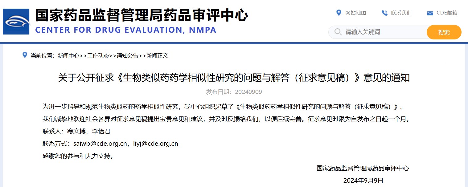 關(guān)于公開(kāi)征求《生物類(lèi)似藥藥學(xué)相似性研究的問(wèn)題與解答(征求意見(jiàn)稿)》意見(jiàn)的通知